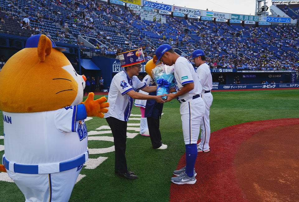 試合前の花束贈呈セレモニーや始球式は、当社社員が務めました。